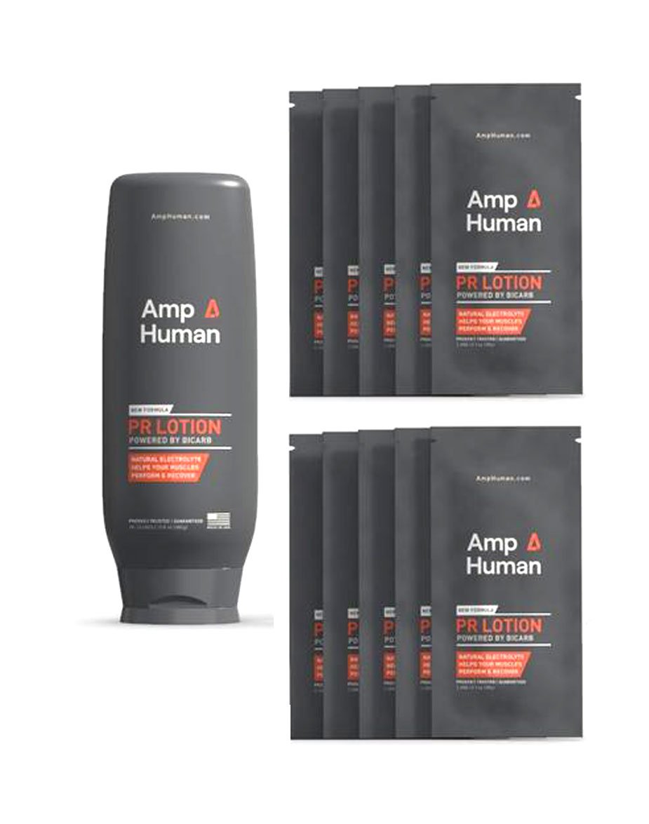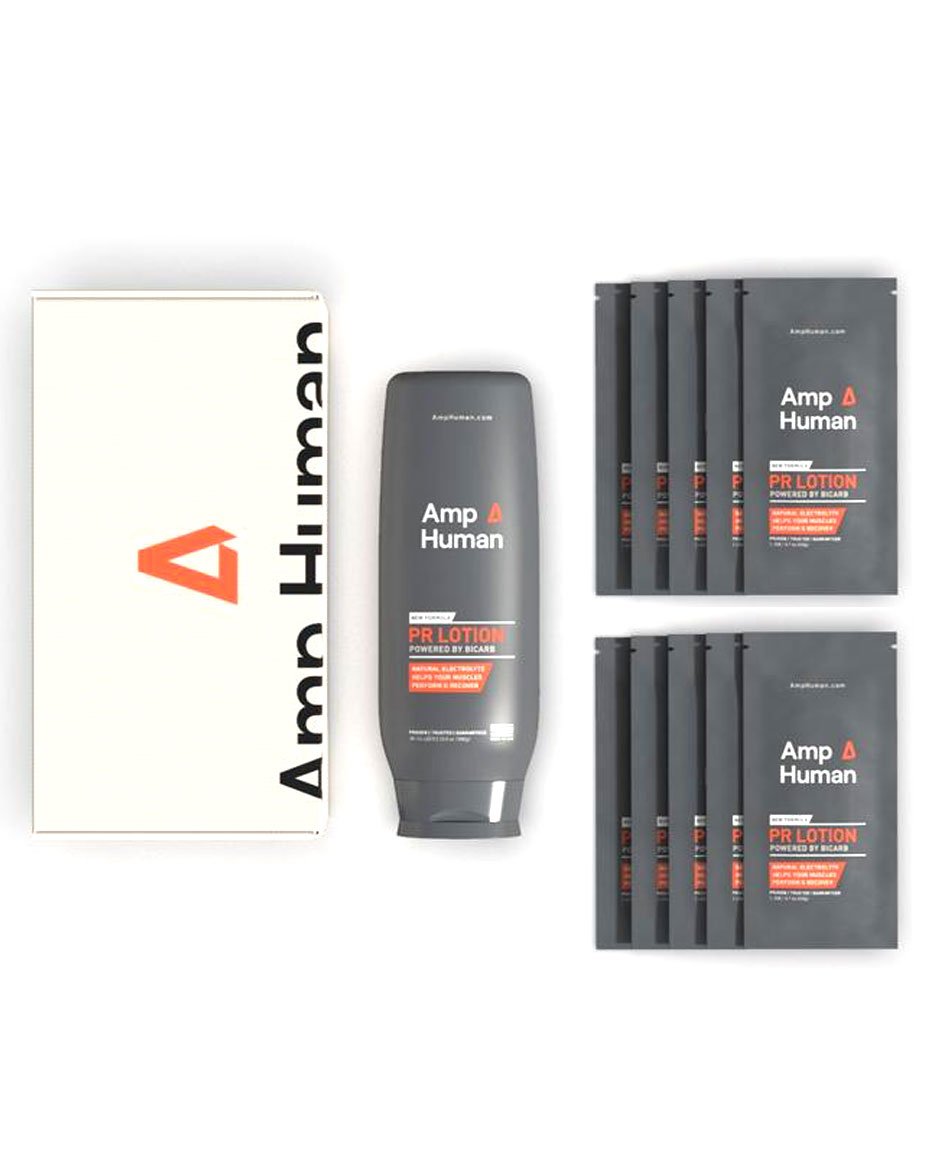 Get more from every training session with PR lotion. Kit includes 1 bottle and 10 one-dose sachets which combined, support up to 25 workouts.