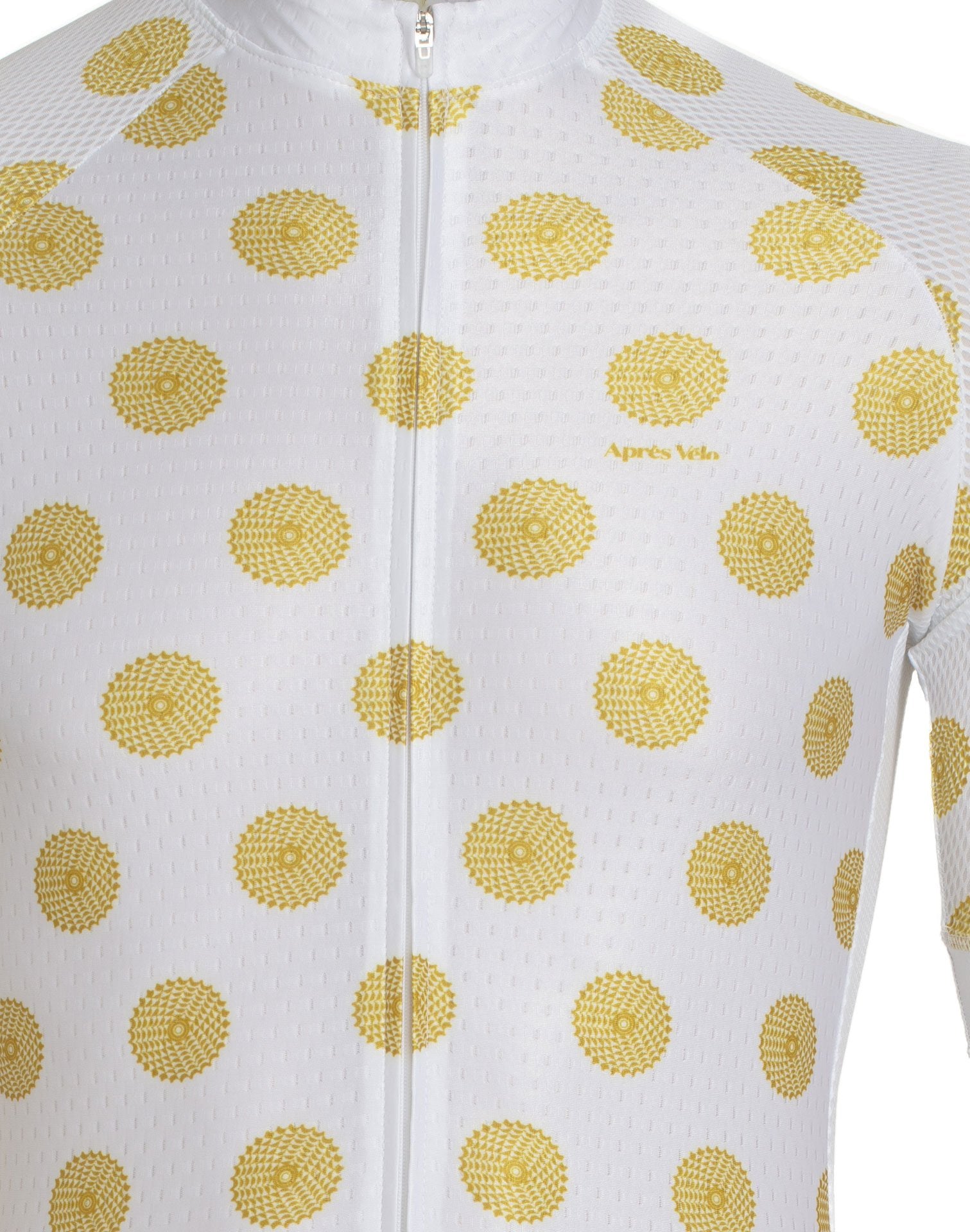 A stylish jersey with a twist. A classic polka dot from a distance. A Warhol inspired Cog close up.
